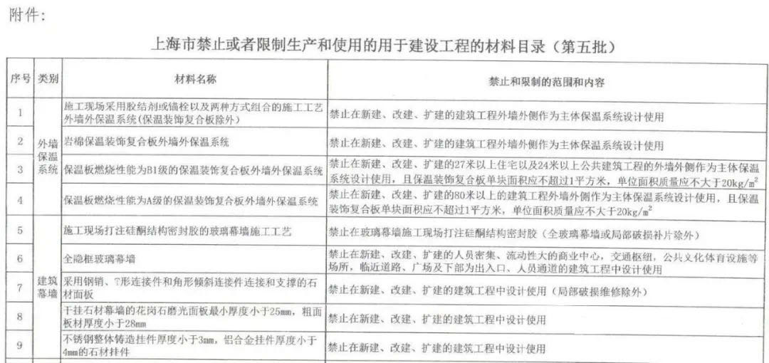 上海市住建委在2020年9月30日發(fā)布了《上海市禁止或者限制生產(chǎn)和使用的用于建設(shè)工程的材料目錄(第五批)征求意見稿》,如今正式文件即將重磅登臺(tái)(后附正式文件原文),其中涉及到外墻外保溫系統(tǒng)的有4條: